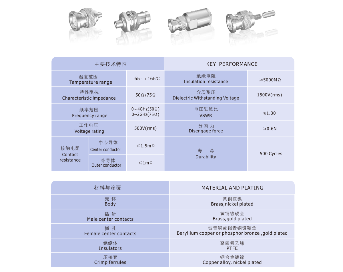 Series BNC are bayonet -coupling popular coaxial connectors, which have the excelletn performaces of rapid connect/disconnect, high reliability, are used to connect RF coaxial cables in electrical and electronic equipment and instruments.