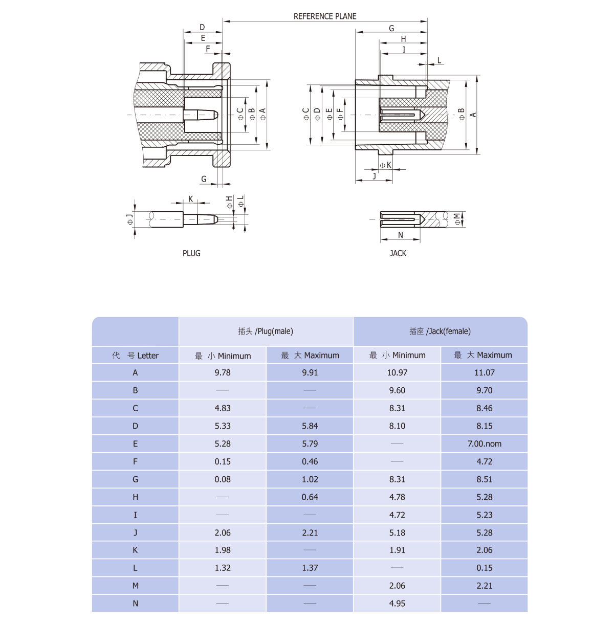 The interface dimaensions and technical characteristics are in accord with the specifications fo MIL-C-39012, IEC-169-8, CECC22120 and BS9210 N004.