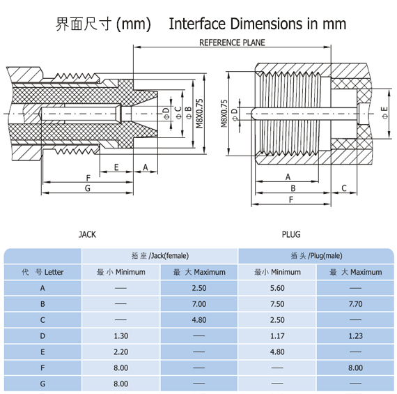 The interface dimensions and technical characteristics are in accord with the specifications of IEC 1169-33 and MIL-STD-348A/321.