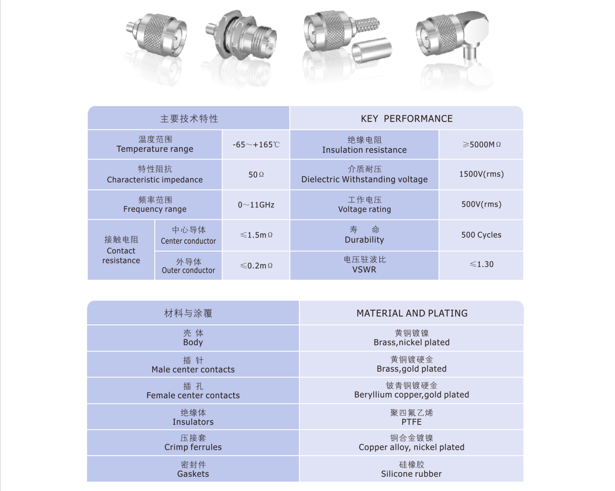 The series TNC connectors are popular thread coupling middle-power coaxial connector, it have characteristics of reliable connect and vibration-proof,for the connect RF coaxial-cables in electronic equipment and instruments, and can be inter-changeable with the same-type connectors of abroad. The interface dimensions and technical characteristics are in accord with the specifications of MIT-C-39012, IEC169-17 and CECC22200. Characteristic impedance 50 Ohm, 75 Ohm. 50 Ohm and 75 Ohm versions can be interconnected without restriction.