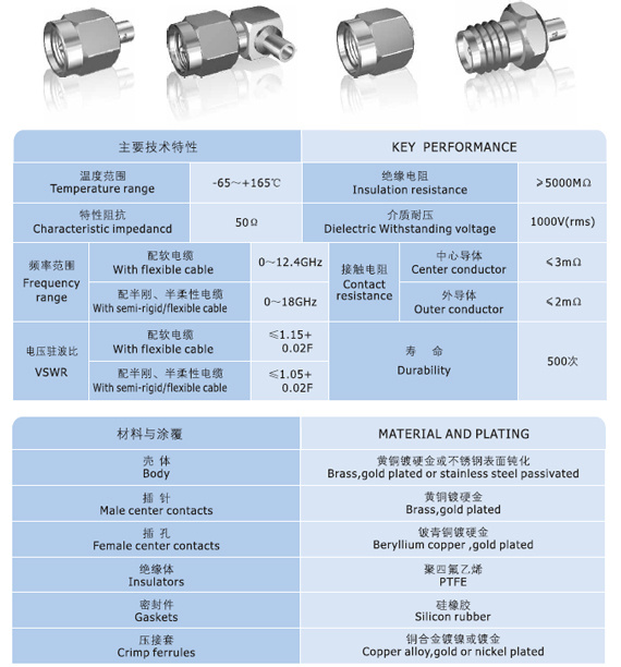 Series SMA are very popular tread coupling miniature coaxial connectors, which have the excellet performancs of high reliability, high mechanical strength, high durability, and optimum electrical properties, are widely used to connect RF coaxial cables for mobile communiction equipments and electronic communication instruments.